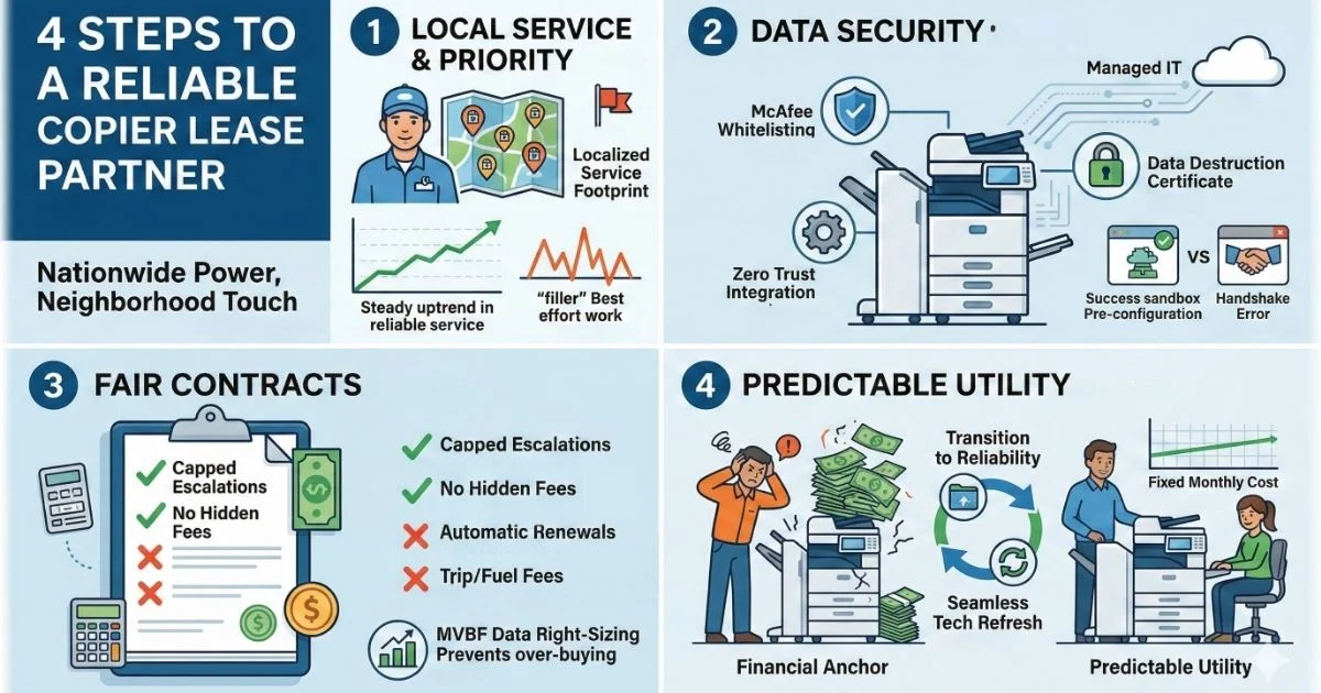 Four-step guide to a Reliable Copier Lease in Baltimore, covering local service footprints, Data Security, Fair Contracts, and Predictable Utility.